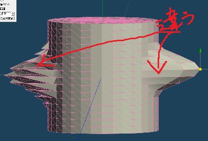こちらがRokuroで作成したセカンドライフbmpからobjファイルに変換したものです.赤矢印を見てください.Rokuroのプログラムの中身はわからないので処理内容は不明ですが,作成されたobjファイルの面の貼り方は矢印の様にねじれています.ですので,こちらをベースに加工しようとすると少し困ったことが起こります.私が知らないだけかもしれませんが,セカンドライフで読み込み可能な形式を保ちつつ編集するには,『頂点数を変化させてはダメ』『真ん中でぶった切ってミラー作成して繋いで頂点数合わせてもダメ』なので,基本的には編集は『頂点の移動』のみになります.そうなると便利なのがメタセコイアのマグネット.しかも対称点も同様に変形可能です.そこで,試しにRokuro製を試してみると,