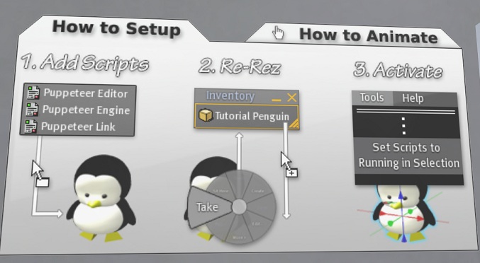 まず,動かしたい人形をプリムを組み合わせて作ります.画像のペンギンがそうですね.次に,PP内あった3つのScriptファイルを作成した人形にコピーします.で,こいつを一旦『取り』ます.取ったらすぐにRez.するとScriptを実行して,みたいなメッセージが表示されます.そしたらSLのwindowのメニューバー内のtoolからScriptを実行します.はい,これで準備完了.