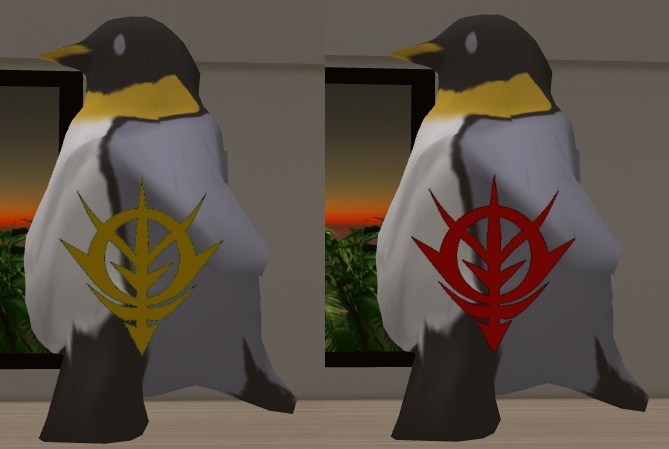 後ろにでっかいペンギンがいますが,これは今回の話と関係ないです.今回のテーマは,ペンギンの上に重なって見える『ジオン軍のマーク』です.これは,ペンギンのずっと手前に箱のプリムがあって,その面にtextureを貼ったものなのです.なんで透けてるかって?どうやらtextureには透過情報を残した画像を利用できるようなのですよ.しかも,色をつけると透明部分はそのままで,可視部分だけ色がかわる!これは非常に便利ですね.色違いのデカール簡単に作れますから.