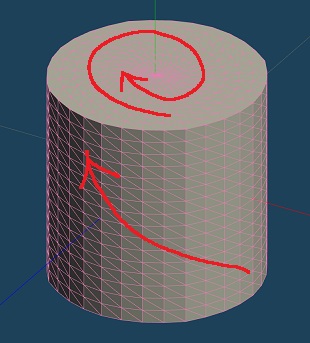 こちらがRokuroで作成したセカンドライフbmpからobjファイルに変換したものです.赤矢印を見てください.Rokuroのプログラムの中身はわからないので処理内容は不明ですが,作成されたobjファイルの面の貼り方は矢印の様にねじれています.ですので,こちらをベースに加工しようとすると少し困ったことが起こります.私が知らないだけかもしれませんが,セカンドライフで読み込み可能な形式を保ちつつ編集するには,『頂点数を変化させてはダメ』『真ん中でぶった切ってミラー作成して繋いで頂点数合わせてもダメ』なので,基本的には編集は『頂点の移動』のみになります.そうなると便利なのがメタセコイアのマグネット.しかも対称点も同様に変形可能です.そこで,試しにRokuro製を試してみると,