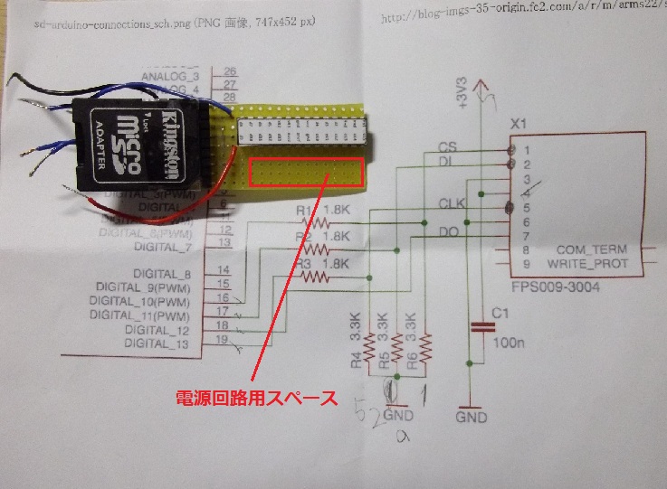 変換ソケットの下に,背景となっている回路図(電源の分圧だけだけど・・・)が配線されています.回路図は以前紹介した『なんでも作っちゃうかも』というページのSDカードに関する記事からの引用です.導線はArduinoに接続するように先は半田を乗せています.