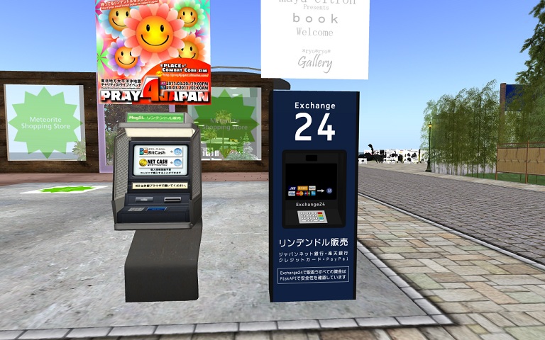 課金ができたら,SL内で写真に示されている(右側)ようなATMを見つけましょう.ちなみに画像は『Ikebukuro 160,138,21』という場所です.楽天銀行の場合は,200円から換金できますが,SL内に持ち込む際にさらに105円の手数料がかかります.なんだか,手数料ばかりですね.あとは,プレイ開始10日以下ですと換金できません.注意してね.