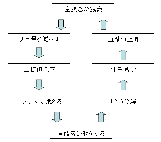 説明しよう!一見貯蓄した脂肪を消費しつくすまでサイクルが回る気がするが,重要なのは食事量を減らすことで食事しないではダメ.まず,一番重要なことは,脂肪を分解しそれを『消費』すること.消費しないと体重は減少しないよね.じゃ,何処で消費されるか.それは当然筋肉である.DDCの『食事量を減らす』を『食事をしない』に変えたとしよう.飢餓時に人間はエネルギーを何処から作るかというと,蛋白質を分解するのである.まあ,当然その際に脂肪も分解され外見は痩せるだろうが,蛋白質が不足し筋肉量が減少すると先に説明した消費の効率が落ちる.ということは,基礎代謝も低下するしエネルギ消費量も減っちゃうんだよね.つまり,適度な食事は重要だということ.決して食べたい言い訳なんかじゃない.
