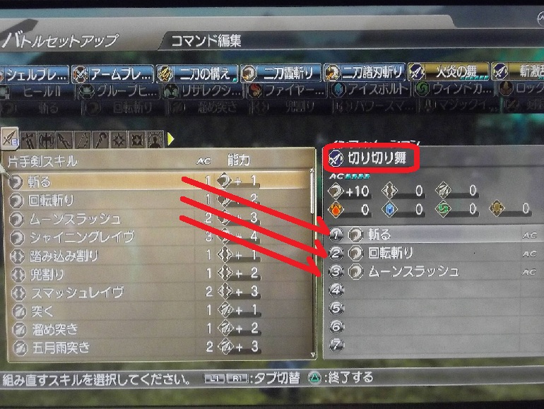 左側のウィンドウ内には,今このキャラが使用できる通常技が列挙されています.上から.『斬る』『回転斬り』『ムーンスラッシュ』となっていますね.これら通常技を発動したい順番に並べて1つのコンボ技として設定ができるのです.しかも,そのオリジナルコンボに自分で技名をつけられる!私は『切り切り舞』と名づけました(赤枠).中二臭いですね.でも,それが楽しい.